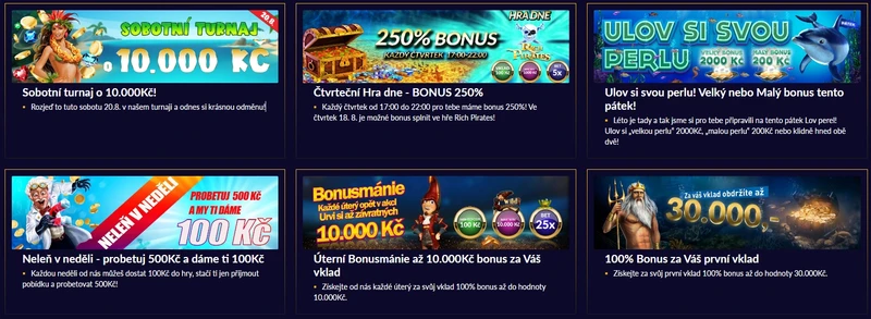 - „Lov perel“ v pátek – před začátkem víkendu si můžete ulovit „velkou perlu“ za 2 000 Kč nebo „malou perlu“ za 200 Kč, případně oba dárky najednou. Pro získání maximální výhry musíte vložit minimálně 2 000 Kč, zatímco pro výhru minimálního dárku stačí vložit alespoň 200 Kč.